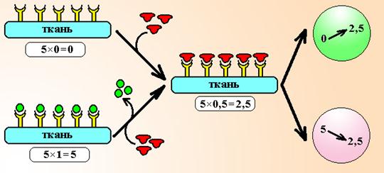 Схема 2. Действие парциальных агонистов. Предположим, что имеется тест-ткань, несущая всего 5 рецепторов. Если рецепторы свободны, ответ ткани равен нулю. После добавления парциального агониста с внутренней активностью 0,5 он будет активировать рецепторы и общий ответ ткани составит 5´0,5=2,5 ЕД. Если рецепторы уже заняты полным агонистом, ответ ткани максимальный (5´1,0=5 ЕД), при добавлении к системе парциального агониста он начинает вытеснять лиганд из связи с рецептором и будет активировать их слабее полного агониста. Общий ответ ткани при этом уменьшится и составит 5´0,5=2,5 ЕД, т.е. возникнет эффект блокады. Можно показать, что чем больше изначальное число активированных рецепторов в ткани, тем будет более выражен блокирующий эффект парциального агониста. [ Инверсные агонисты – это вещества, которые связываются с рецепторами и вызывают эффект обратный тому, который возникает при действии обычного агониста. Т.е. внутренняя активность реверсных агонистов меньше нуля (-1,0). Инверсные агонисты не следует путать с антагонистами. Антагонист предупреждает эффект агониста, блокируя рецептор, инверсный агонист – вызывает при взаимодействии с рецептором зеркально противоположный эффект. Примером реверсных агонистов могут служить b-карболины. Диазепам является агонистом бензодиазепин-ГАМК рецепторного комплекса и вызывает при активации рецептора развитие седативного и снотворного эффектов. Флумазенил – антагонист этих рецепторов, если его ввести в организм пациента, то воспроизвести снотворное действие диазепама не удается. b-карболины при взаимодействии с бензодиазепиновым рецептором будут вызывать судороги (качественно противоположный снотворному действию диазепама эффект).