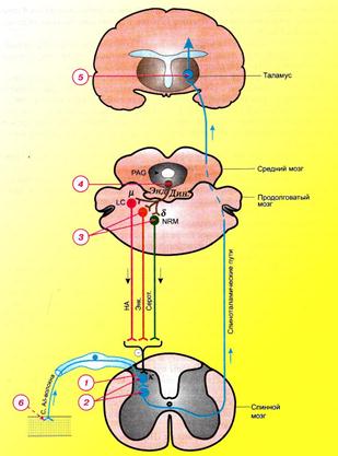 Схема 1. Ноцицептивная и антиноцицептивная система. Нейроны неоспиноталамического пути ноцицептивной системы показаны синим цветом. PAG – околоводопроводное серое вещество; NRM – большое ядро шва; LC – синее пятно. НА – норадреналин, Серот. - серотонин, Энк. – энкефалины, Энд. – эндорфины, Дин – динорфины. Цифрами на схеме показаны участки приложения действия опиоидных анальгетиков на соответствующие рецепторы: 1, 2 – угнетение нейронов задних рогов спинного мозга, 3, 4 – стимуляция антиноцицептивных нейронов ретикулярной фармации ствола мозга, 5 – торможение нейронов таламических ядер, 6 – снижение чувствительности ноцицепторов. Опиоидные пептиды и их рецепторы. Медиаторами антиноцицептивной системы являются 3 семейства пептидов: · Эндорфины - b-эндорфин; · Энкефалины – лей- и мет-энкефалин; · Динорфины – динорфин А и В.