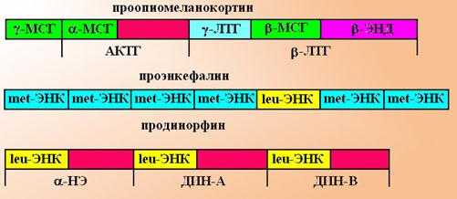 Схема 2. Молекулы-предшественницы опиоидных пептидов. МСГ – меланоцитстимулирующий гормон, ЛТГ – липотропный гормон, ЭНД – эндорфин, ЭНК-энкефалин, НЭ - неоэндорфин, ДИН – динорфин. Опиоидные пептиды образуются из 3 молекул предшественниц: 1) проопиомеланокортина – дает начало g-меланоцитстимулирующему гормону, АКТГ и b-липотропному гормону, который в последующем расщепляется до b-эндорфина; 2) проэнкефалину – распадается на несколько копий мет-энкефалина и 1 копию лей-энкефалина; 3) продинорфин – распадается на 3 молекулы - a-неоэндорфин, динорфин А и В, каждая из которых содержит по одной копии лей-энкефалина. Опиоидные пептиды взаимодействуют с особыми опиоидными рецепторами и активируют их. Различают следующие типы опиоидных рецепторов (таблица 1.): Таблица 1. Характеристика опиоидных рецепторов.