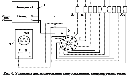 Схема экспериментальной установки показана на рис. 6. Из указанной схемы установки видно, что выходной сигнал от прибора «Амплипульс – 5» - 1 подается на внешнюю нагрузку ( Параллельно внешней нагрузке подключен электронный осциллограф (ЭО) – 3, с использованием которого и наблюдается характер изменения формы модулируемого синусоидального сигнала при различных родах работ, в том числе и минимальный размах напряжения на внешней нагрузке.