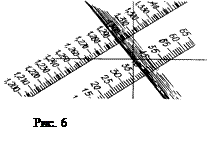 В первом случае пучок света от источника направляется на грань призмы 4 АВ (рис. 4), во втором случае на грань призмы 5. На приборе исследуются вещества, показатель преломления которых меньше показателя преломления измерительной призмы. Показатель преломления прозрачных жидкостей определяют в проходящем свете. Каплю исследуемой жидкости помещают между двумя гипотенузными гранями призмы — осветительной 4 и измерительной 5 (рис. 4). Гипотенузная грань измерительной призмы отполирована, а осветительной — матовая. Вследствие рассеяния света матовой поверхностью в исследуемый раствор входят лучи различных направлений. Далее они проходят тонкий слой раствора и падают на грань измерительной призмы 5. Так как показатель преломления раствора меньше показателя преломления стенки измерительной призмы 5, то лучи всех направлений, преломившись на границе жидкость-стекло, войдут в призму 5. С увеличением угла падения q/ угол преломления q также увеличивается, достигая максимального значения при угле падения q/ = 90о, т.е., когда падающий луч скользит по поверхности грани DE. Тогда, подставляя значения q = 90о в формулу (5), получим: