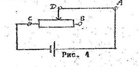 Реостаты применяются для изменения силы тока в цепи. Реостаты бывают различных видов: ламповые, роликовые, ползунковые со скользящим контактом. Эти реостаты состоят из фарфорового или шиферного цилиндра, на который намотана проволока, изготовленная из металла большим удельным сопротивлением. По проводнику может перемещаться контакт (ползунок) D (рис. 4), позволяющий постепенно