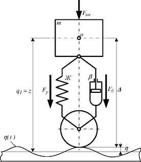 Путь считается абсолютно жестким. Данная модель позволяет оценить особенности динамических свойств, определяемых ее структурой и характером возмущения, а также данная модель в первом приближении соответствует вагону с одноступенчатым рессорным подвешиванием. Масса m на расчетной схеме соответствует сумме масс кузова и тележек, а жесткость Ж и коэффициент затухания β являются эквивалентными характеристиками рессорного подвешивания. При движении системы, кинематическое возмущение вызывает вертикальные колебания надрессорного строения, которые характеризуются одной обобщенной координатой q1 = z (подпрыгивание). В системе действуют силы: · сила инерции Fин = · упругая сила Fy = · диссипативная сила F∂ = Используя принцип Даламбера, уравнение колебаний рассматриваемой динамической модели записывается Fин + Fy + F∂ = 0. с учетом формул