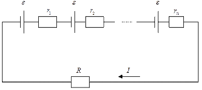где 2.4. Цепи постоянного тока. Электрические цепи постоянного тока состоят из источников питания и нагрузочных сопротивлений R (резистор) соединенных последовательно. Отдельно источники могут быть соединены в батареи последовательно и параллельно. При последовательном согласованном соединении (рис. 2.3) ЭДС и внутреннее сопротивление n источников питания суммируются