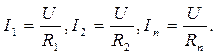 В узлах цепи параллельного соединения сопротивлений не накапливаются и не уничтожаются заряды. Поэтому для узла 1 входящие токи равны выходящим (1-ый закон Кирхгордера)
