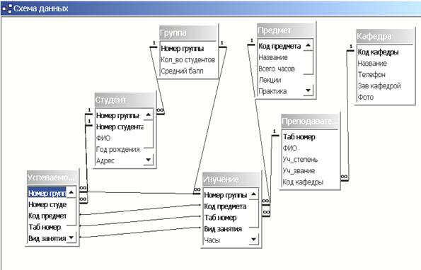 Рис. 1.4. Схема данных БД Учебный процесс Установление связей между таблицами. Чтобы установить связи, нужно открыть окно базы данных и выбрать команду Сервис ® Схема данных. Если связи для базы данных устанавливаются впервые, то Access выведет на экран пустое окно Схема данных и затем окно диалога Добавление таблицы. В этом окне нужно выделить все таблицы, между которыми будут установлены связи и нажать кнопки Добавить и Закрыть. После этого в окне Схема данных связи между таблицами устанавливаются путем перетаскивания мышью поля одной таблицы на поле, по которому устанавливается связь, другой таблицы. При отпускании кнопки мыши на экран выводится окно диалога Связь, в котором выводятся связанные поля. Необходимо установить флажки: Обеспечение целостности данных, Каскадной обновление связанных полей, Каскадное удаление связанных записей. После этого нужно нажать кнопку Создать. Установление флажка «Каскадное обновление связанных полей» позволяет: - если в главной таблице СТУДЕНТ изменить значение поля Номер группы (например, вместо 11 написать 12), то и в подчиненных таблицах 11 поменяется на 12; - если в таблице СТУДЕНТ изменить значение поля Номер группы на такое, которое нет в таблице ГРУППА, то это не удастся сделать. Установление флажка «Каскадное удаление связанных записей» позволяет: если в таблице, например, ГРУППА удалить какую – либо группу, то и в подчиненных таблицах исчезнут все записи, связанные с удаленной группой. При установлении связей между таблицами ключ связи может быть составной, например, связь между таблицами Успеваемость и Изучение осуществляется по нескольким полям. В этом случае установление связи осуществляется так: при нажатой клавише <Ctrl> выделяются все ключи и затем перетаскиваются. Чтобы удалить связь, нужно щелкнуть на ее линии и нажать клавишу Del. Имена полей, по которым осуществляется связь между таблицами: ГРУППА ® СТУДЕНТ (Номер группы) КАФЕДРА ® ПРЕПОДАВАТЕЛЬ (Код кафедры) ПРЕДМЕТ ® ИЗУЧЕНИЕ (Код предмета) ПРЕПОДАВАТЕЛЬ ® ИЗУЧЕНИЕ (Таб номер) ГРУППА ® ИЗУЧЕНИЕ (Номер группы) СТУДЕНТ ® УСПЕВАЕМОСТЬ (Номер студента и Номер Группы) ИЗУЧЕНИЕ ® УСПЕВАЕМОСТЬ (Номер Группы, Код предмета, Таб номер, Вид занятия) Примечание. Если связь между таблицами не устанавливается, возможны следующие причины: а) имена полей, по которым устанавливается связь - различны б) типы связываемых полей - не одинаковы и др. Необходимо проверить все таблицы. 1. 5. Изменение проекта базы данных Для того, чтобы удалить таблицу, ее необходимо выделить в окне базы данных и нажать клавишу Del. Если для удаляемой таблицы определены связи, Access откроет дополнительное окно с сообщением, что необходимо также удалить все связи таблицы. После нажатия на кнопку Да Access удалит все связи и саму таблицу. Переименование таблиц Чтобы переименовать таблицу, ее необходимо выделить в окне базы данных и выполнить команды Правка ® Переименовать. Внести новое имя таблицы и нажать клавишу Enter.
