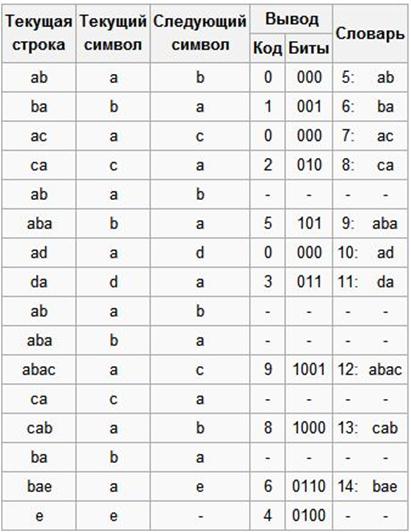 · Шаг 1: Тогда, согласно изложенному выше алгоритму, мы добавим к изначально пустой строке “a” и проверим, есть ли строка “a” в таблице. Поскольку мы при инициализации занесли в таблицу все строки из одного символа, то строка “a” есть в таблице. · Шаг 2: Далее мы читаем следующий символ «b» из входного потока и проверяем, есть ли строка “ab” в таблице. Такой строки в таблице пока нет. · Добавляем в таблицу <5> “ab”. В выход: <0>; · Шаг 3: “ba” — нет. В словарь: <6> “ba”. В выход: <1>; · Шаг 4: “ac” — нет. В словарь: <7> “ac”. В выход: <0>; · Шаг 5: “ca” — нет. В словарь: <8> “ca”. В выход: <2>; · Шаг 6: “ab” — есть в словаре; “aba” — нет. В словарь: <9> “aba”. В выход: <5>; · Шаг 7: “ad” — нет. В словарь: <10> “ad”. В выход: <0>; · Шаг 8: “da” — нет. В словарь: <11> “da”. В выход: <3>; · Шаг 9: “aba” — есть в словаре; “abac” — нет. В словарь: <12> “abac”. В выход: <9>; · Шаг 10: “ca” — есть в таблице; “cab” — нет. В словарь: <13> “cab”. В выход: <8>; · Шаг 11: “ba” — есть в таблице; “bae” — нет. В словарь: <14> “bae”. В выход: <6>; · Шаг 12: И, наконец последняя строка “e”, за ней идет конец сообщения, поэтому мы просто выводим <4>.