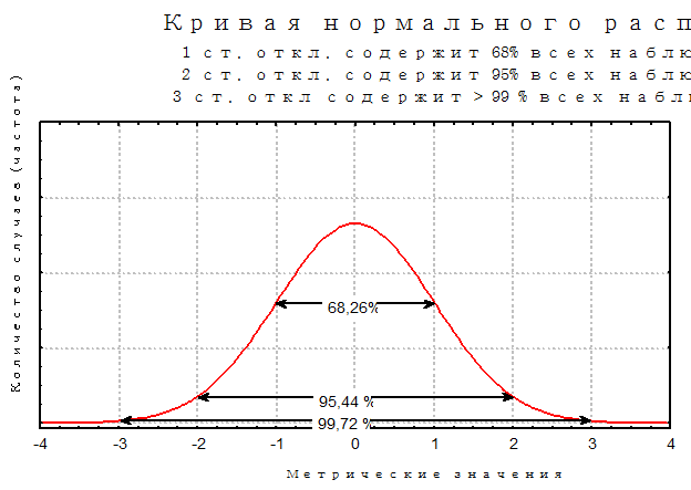 Нормальное распределение Одним из важнейших в математической статистике является понятие нормального распределения. Нормальное распределение (называемое также распределением Гаусса), характеризуется тем, что крайние значения признака в нем встречаются достаточно редко, а значения, близкие к средней величине – часто. Нормальное распределение возникает, когда данная случайная величина представляет собой сумму большого числа независимых случайных величин, каждая из которых играет в образовании всей суммы незначительную роль. Нормальное распределение имеет колоколообразную форму, значения моды, медианы и среднего арифметического равны между собой. Было установлено, что многие биологические параметры распределены подобным образом (рост, вес и так далее). Впоследствии психологи выяснили, что и большинство психологических свойств (показатели интеллекта, темпераментных особенностей, способностей и другие психические явления) также имеют нормальное распределение. Этот принцип учитывается при стандартизации тестовых методик. При этом, чем больше объем выборки, тем более полученное эмпирическое распределение приближается к нормальному. Характерное свойство нормального распределения состоит в том, что 68,26 % из всех его наблюдений всегда лежат в диапазоне ± 1 стандартное отклонение от среднего арифметического (какова бы ни была величина стандартного отклонения). 95,44 % - в пределах ± двух стандартных отклонений и 99,72 – в пределах ± трех стандартных отклонений.