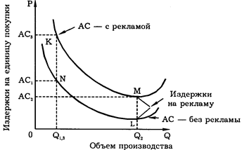 Олигополия. Рис. 9.3. Возможное влияние рекламы на объем производства и средние совокупные издержки