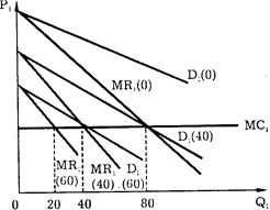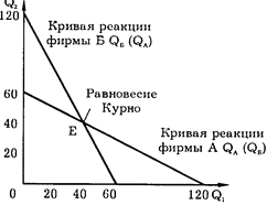 Допустим, одна из фирм (например, Б) принимает решение о приостановке производства. Тогда рыночный спрос полностью обеспечивается выпуском фирмы А. Ее кривая спроса полностью совпадает с кривой рыночного спроса D1 (0) (рис. 9.4). При выборе максимизирующего прибыль объема производства фирма А решит производить 120 единиц товара, так как именно при этих условиях сравняются предельный доход MR1 (O) и предельные издержки МС. Если теперь фирма Б будет производить 40 единиц, то фирма А отреагирует на это сдвигом кривой спроса до положения D1 (40), а ее производство сократится до 40 (именно в этом случае MR1 (40) = МС1). Соответственно, когда фирма Б производит 60 единиц, фирма А уменьшает свой выпуск до 20 единиц, а когда фирма Б расширит производство до 120 единиц, фирма А вообще остановит свое производство. Отмечая на графике (рис. 9.5), как меняется выпуск фирмы А в зависимости от изменения выпуска фирмой Б, мы получаем кривую реакции фирмы А — QА(QБ). Аналогичный анализ можно осуществить и в отношении фирмы Б, получив в результате еще одну кривую реакции — QБ(QА). Пересечение кривых реагирования этих двух фирм (точка Е) показывает равновесие Курно: каждая фирма правильно угадывает поведение конкурента и принимает оптимальное для себя решение, ни одна из фирм не имеет стимула изменять свой объем производства.
