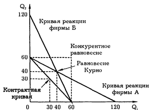 Модель равновесия Курно предполагает, что фирмы-дуополисты конкурируют друг с другом. Ситуация принципиально изменится, если дуополисты договорятся друг с другом и будут коллективно намечать объем производства. Рассмотрим этот случай, предполагая идентичность обеих фирм и линейную кривую спроса (рис. 9.4). Равновесие Курно достигается, когда Q1 = Q2 = 40, а суммарный выпуск составляет 80 единиц. Если фирмы договорятся максимизировать совокупную прибыль, чтобы затем разделить ее пополам, то множество возможных решений этой задачи будет ложиться на контрактную кривую. При этом суммарный выпуск Q1 + Q2 = 60. Сравнение показывает, что при равновесии Курно общий объем производства выше, чем при дуополистическом сговоре (40 > 30), но ниже, чем он был бы при конкурентном равновесии (40 < 60).