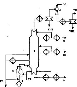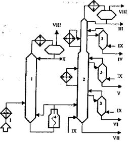 1 - отбензнивающая колонна, 2 - атмосферная колонна, 3 - отпарные колонны, 4 - атмосферная печь, I - нефть с ЭЛОУ, II - легкий бензин, III - тяжелый бензин, IV - фракция 180 -220οС, V- фракция 220 - 280°С, VI -фракция 280 - 350°С, VII - мазут, VIII - газ, IX -водяной пар
