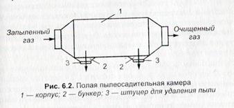 Весьма простыми устройствами являются пылеосадительные камеры, в которых за счет увеличения сечения воздуховода скорость пылевого потока резко падает, вследствие чего частицы пыли выпадают под действием сил тяжести. Пылеосадительные камеры используются для очистки от крупных частиц пыли и применяют в основном для предварительной очистки воздуха. Эффективность улавливания в них зависит от времени пребывания газов в камере и расстояния, проходимого частицами под действием гравитационных сил. В свою очередь время пребывания газов зависит от объема камеры и скорости потока.