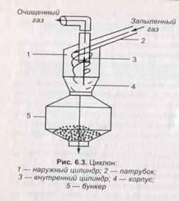 Эффективными пылеуловителями являются инерционные аппараты, в которых пылевой поток резко изменяет направление своего движения, что способствует выпадению частиц пыли. К ним относятся аппараты, в которых действие удара о препятствие используется в большей степени, чем инерция. Широко распространенными инерционными пылеуловителями являются циклоны. Внихчастицы пыли движутся вместе с вращающимся газовым потоком и под воздействием центробежных сил оседают на стенках. Циклоны широко применяются для улавливания частиц размерами около 10 мкм при скоростях газового потока от 5 до 20 м/с. По конструкции циклоны подразделяются на циклические, конические и прямоточные.