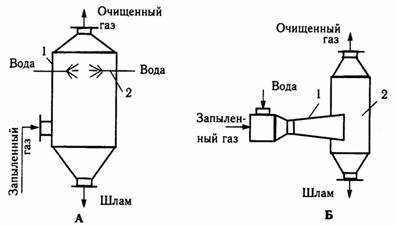 Указанные устройства имеют одну весьма важную особенность: они обладают высокой эффективностью очистки от мелкодисперсной (менее 1 мкм) пыли. Имеются и другие достоинства, среди которых: 1) относительно небольшая стоимость и высокая эффективность улавливания взвешенных частиц; 2) возможность очистки газов при относительно высокой температуре и повышенной влажности, а также при опасности возгорания и взрывов очищенных газов или уловленной пыли. В качестве существенного недостатка можно указать на то, что уловленная пыль представлена в виде шлама. Большое распространение (в основном из-за простоты конструкции получили полые форсуночные скрубберы. Они представляют собой колонну круглого сечения, в которой осуществляется контакт между запыленным газом и каплями жидкости (обычно водой). Высота скруббера составляет 2,5 его диаметра.