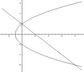 Пример. Вычислить площадь фигуры, ограниченной линиями y2 = 4x + 4; x + y – 2 = 0. Построим графики заданных функций: