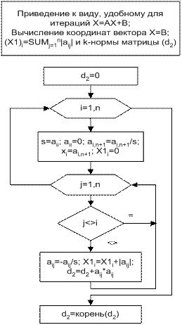 (модули диагональных элементов больше суммы модулей всех остальных элементов столбца). Если условия (9) не выполняется, следует проверить условие сходимости по l- и k-нормам к системе (1) или после приведения ее к виду (2). Блок-схема численного решения системы линейных алгебраических уравнений методом итераций