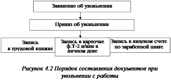 Заявление, чаще всего, пишется от руки, но организация может иметь и трафаретную форму. В заявлении указывается должность, структурное подразделение, куда работник устраивается и условия приема. Оклад и дата приема на работу указываются в визах или в резолюции руководителя. Заявление подписывается, указывается дата. Резюме и анкета составляются по требованию отдела кадров (департамента по персоналу). Анкета является обязательным документом при трудоустройстве на государственные предприятия. Одним из основных документов, регулирующих правоотношения предприятия с работником, является трудовой контракт (договор). После подписания контракта издается приказ о приеме сотрудника. На основании приказа о приеме оформляется личная карточка формы Т–2 или заводится личное дело, делается запись в трудовой книжке. Копии приказа о приеме поступают в личное дело и в бухгалтерию, где поступившему работнику присваивается табельный номер и на него заводится лицевой счет по зарплате. Увольнение работника производится с оформлением документов по следующей схеме (рисунок 4.2):