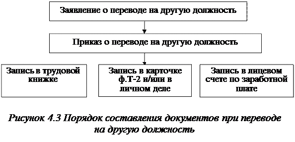 Руководитель предприятия или организации издает приказ по личному составу о переводе сотрудника на другую должность, на основании которого делается соответствующая запись с указанием новой должности в трудовой книжке и в личной карточке ф.Т–2. Копии приказа направляются в личное дело и в бухгалтерию, и в случае изменения оклада производится соответствующее изменение в лицевом счете по заработной плате.