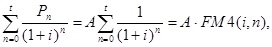 Множитель FM2(i,n) называется факторным (дисконтирующим) множителем, он показывает сегодняшнюю цену одной денежной единицы будущего n периодов спустя, от момента расчета при заданной процентной ставке i. Если P1 = P2=... Pn = А, т.е. денежный поток с равными поступлениями (аннуитет), то