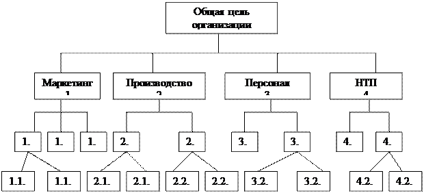 Дерево целей организации Установление целей Количество и разнообразие целей и задач организации настолько велики, что без комплексного, системного подхода к определению их состава и взаимосвязей не может обойтись ни одно предприятие, независимо от размеров, специализации и форм собственности. На практике для этого используется построение целевой модели в виде древовидного графа - дерева целей. Посредством дерева целей описывается их упорядоченная иерархия, для чего осуществляется последовательная декомпозиция главной цели на подцели. При построении дерева целей используются следующие принципы: - главная цель, находящаяся в вершине графа, должна содержать описание конечного результата; - при развертывании главной цели в иерархическую структуру целей соблюдается правило: реализация подцелей каждого последующего уровня является необходимым и достаточным условием достижения цели предыдущего уровня; - количество уровней декомпозиции зависит от масштабов и сложности поставленных целей, принятой в организации структуры, иерархии ее менеджмента; - при формулировании целей разных уровней следует описывать желаемые результаты, а не способы их достижения; - подцели каждого уровня должны быть взаимонезависимы и не выводимы одна из другой; - фундамент дерева целей должны составлять задачи, представляющие собой формулировку работ, которые могут быть выполнены определенными способами и в заранее установленные сроки.