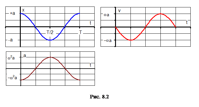 Из формулы видно, что период колебаний зависит только от свойств самой системы. Для описания колебательного периодического движения вводится еще несколько величин: а) n – частота колебаний – это величина численно равная числу колебаний в единицу времени. б) w0 = 2pn – круговая или циклическая частота (w0 – число колебаний за 2p секунд). Для колебательного процесса смещение, скорость и ускорение можно представить как аналитически: 1. 2. 3.