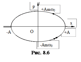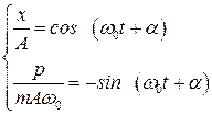 В каждом положении, характеризуемом отклонением “x”, осциллятор имеет некоторое значение ”p”. Чтобы найти ”p” как функцию ”x”, нужно исключить ”t” из написанных для ”p” и ”x” уравнений, Представим эти уравнения в виде: