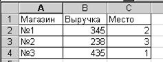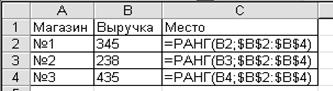 Полный синтаксис функции РАНГ: Число – адрес ячейки или просто число, для которого определяется ранг. Ссылка – заданный диапазон чисел. Если признак сортировки отсутствует, то о Excel определяет ранг числа так, как если бы ссылка была списком, отсортированным в порядке убывания, а если присутствует (отличное от нуля число) – в порядке возрастания. На рис. 6.2 представлен пример применения функции РАНГ. Для трех магазинов необходимо определить занимаемое место по полученной выручке (в порядке убывания). Обратить внимание (при копировании С2 в С3:С4) на абсолютные адреса ячеек ссылки в команде = РАНГ (B2; $B$2: $B$4).