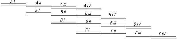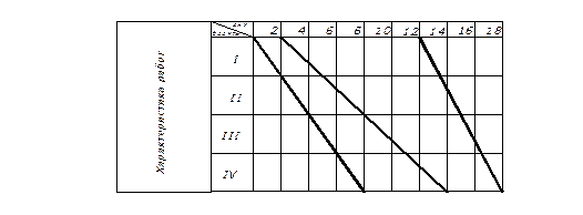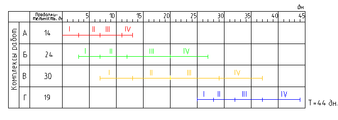 «+»: 1) простота; 2) удобство; 3) под графиком в том же масштабе времени можно построить график движения рабочих. «–»: 1) видно время выполнения работы, но не указано место выполнения работы; 2) нечетко показаны связи между работами, т.е. не видно из графика, все ли условия поточной организации работ выполнены.