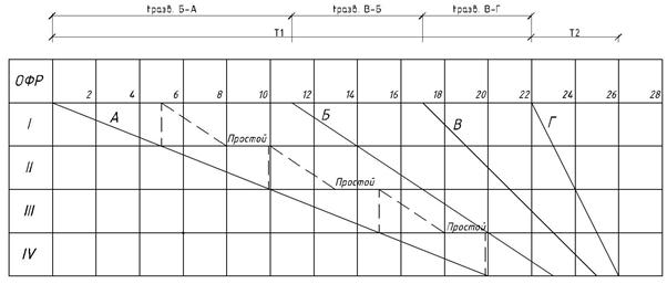 Расчет неритмичных потоков достаточно сложен. В 50- х гг. ХХ в. их рассчитывали, приводя к кратноритмичным потокам, усредняя продолжительности работ на отдельных фронтах. Такой способ не давал требуемой точности, был приближенным. В 1964г. В.В. Чихачев предложил графический метод расчета неритмичных потоков.