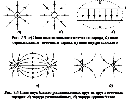 Саму же напряжённость следует заранее рассчитать, пользуясь уже рассмотренным принципом суперпозиции, применяя теорему Гаусса (о ней речь пойдёт позднее) и просто (если это возможно) заранее измерить с помощью соответствующих приборов. Электрическое поле можно отображать графически с помощью силовых линий. Силовой называется линия, касательная в каждой точке к которой совпадает по направлению с силой, действующей в электрическом поле на точечный положительный заряд, помещаемый в эту точку. Силовые линии начинаются на положительных зарядах и заканчиваются на отрицательных (или уходят в бесконечность). Очевидно, силовые линии не должны пересекаться, поскольку, если бы хотя бы пара линий пересеклась в какой-то точке поля, то в этой точке можно было бы провести две касательные (по одной к каждой линии), а, значит, однозначно определить направление действия кулоновской силы на помещаемый туда заряд было бы нельзя. Примеры картин силовых линий полей, создаваемых отдельными зарядами и системами зарядов, приведены на рис. 7.3 – 7.5.