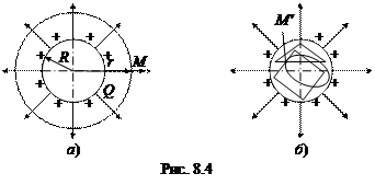 Для области вне сферы: рисуем чертёж, изображаем силовые линии, выбираем точку М, находящуюся на расстоянии r от центра сферы, проводим через неё одну из силовых линий, после чего выбираем замкнутую поверхность, соответствующую симметрии задачи и проходящую через эту точку. Очевидно, такой поверхностью будет сфера, центр которой совпадает с центром сферы, напряжённость электрического поля которой мы рассчитываем (рис. 8.4. а). Теперь считаем поток вектора F E = В силу симметрии выбранной поверхности напряжённость электрического поля в любой её точке должна быть одинаковой: F E = Но по определению интеграла Применим теорему Гаусса: выбранной поверхностью охватывается весь заряд + Q, поэтому можно записать: 4p r 2 E = E = Для любой точки М ¢в области, находящейся внутри заряженной сферы, можно выбрать сколь угодно много замкнутых поверхностей, проходящих через эту точку и при этом лежащих внутри заряженной сферы (рис. 8.4. б). По теореме Гаусса, так как ни одна из таких поверхностей не окружает заряд, то для них для всех F E = 0, независимо от формы. Другими словами, в этом случае