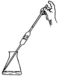 Рис. 49. Пипеточный дозатор Рис. 48. Выливание раствора из пипетки Рис. 47. Положение пипетки при установлении мениска на уровне черты Для удаления капли жидкости, оставшейся на внешней стороне носика пипетки, касаются им внутренней стенки сосуда с отбираемым раствором. 3. Пипетку переносят в другой сосуд (чаще всего в колбу для титрования) и, ослабив нажим указательного пальца, дают из неё вытечь нужному объёму жидкости (рис. 48).