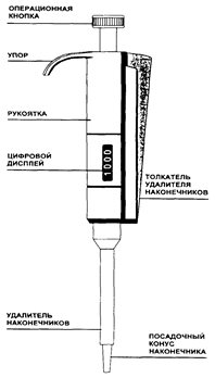 В последнее время всё более широко применяются пипеточные дозаторы или автоматические пипетки. Это специальные устройства, которые позволяют точно отобрать нужный объём жидкости из раствора с помощью простого нажатия на кнопочное устройство, находящееся в их верхней части (рис. 49).