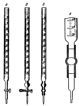 Необходимый для отбора переменный объём жидкости устанавливается с помощью цифрового дисплея, расположенного на рукоятке пипетки. Перед работой с пипеточным дозатором необходимо внимательно прочитать инструкцию по его эксплуатации. Данные устройства являются более удобными по сравнению с пипетками Мора и градуированными пипетками, они позволяют быстрее осуществлять отбор заданного объёма жидкости и к настоящему времени превалируют в повседневной практике научных и исследовательских лабораторий. Единственным недостатком пипеточных дозаторов является их гораздо более высокая стоимость по сравнению с обычными стеклянными пипетками. В титриметрии бюретки используются для постепенного прибавления с регулируемой скоростью одного раствора к другому с последующим измерением общего объёма расходованной при этом жидкости. Таким образом, с помощью бюреток непосредственно осуществляется сам процесс титрования. Бюретка представляет собой узкую стеклянную трубку, на которую нанесена шкала (рис. 50).