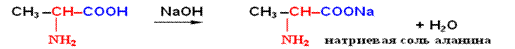 Аминогруппа, которая в аминах проявляет себя как нуклеофил, в биполярном ионе полностью лишена нуклеофильности из-за протонирования, поэтому ни реакция алкилирования по Гофману, ни ацилирование, свойтвенные аминам, не имеют места в случае аминокислот. Эти реакции могут происходить только при условии предварительного депротонирования аминогруппы, что достигается использованием реакционной среды с высоким значением рН, при которых цвиттер-ион полностью превращен в карбоксилат-анион. Алкилирование осуществляют, действуя на полученные соли минокислот алкилгалогенидами в присутствии оснований (как органических, так и неорганических). Ацилирование также требует предварительного превращения цвиттер-иона в карбоксилат-анион и успешно протекает при наличии в реакционной среде эквивалента основания (основание необходимо для связывания, выделяющегося при ацилировании кислого продукта – галогеноводорода или карбоновой кислоты).