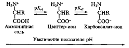 В водных растворах и твердом состоянии аминокислоты существуют только в виде внутренних солей — цвиттер-ионов. Кислотно-основное равновесие для аминокислоты может быть описано: