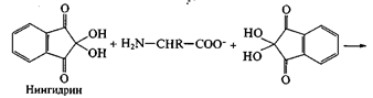 Образование оснований Шиффа (как типичная реакция аминов) свойственно и аминокислотам; наиболее часто используют реакции аминокислот с бензальдегидом: На образовании оснований Шиффа основана реакция идентификации аминокислот, известная как «нингидриновая проба», широко применяемая для визуализации зон аминокислот (возникает интенсивное сине-фиолетовое окрашивание) при их хроматографическом и электрофоретическом разделении, а также для количественного определения содержания аминокислот в растворах: