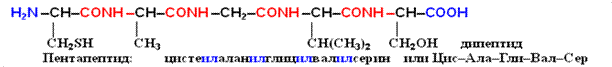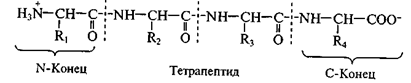 Полипептидная цепь состоит из регулярно повторяющихся участков, образующих остов молекулы, и вариабельных участков – боковых радикалов аминокислотных остатков. Началом полипептидной цепи считают конец, несущий свободную аминогруппу (N-конец), а заканчивается полипептидная цепь свободной карбоксильной группой (С-конец). Как правило, при изображении формулы пептида N-конец располагают слева, а С-конец — справа: