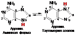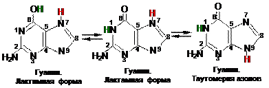 Следует отметить, что пиримидиновые основания в составе полинуклеотидов представлены лактамной формой (содержащей карбонильныю группы С=О), что обусловлено возможностью образования водородных связей между остатками оснований в цепях нуклеиновых кислот: тимин – аденин; цитозин – гуанин в ДНК; урацил – аденин и цитозин – гуанин в РНК. Аденин и гуанин являются представителями пуриновых нуклеиновых оснований. Эти гетероциклические соединения способны к лактим-лактамнойтаутомерии и таутомерии азолов