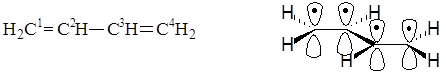 Пространственное строение бутадиена-1,3 Так как молекула имеет плоскую конфигурацию, то все s-связи, образованные с участием гибридных орбиталей, лежат в одной плоскости, а негибридные р-орбитали расположены перпендикулярно плоскости молекулы и параллельно между собой. Образование p-связей между атомами С1 и С2 и между атомами С3 и С4 происходит за счет двукратного перекрывания р-орбиталей с обеих сторон относительно плоскости молекулы, но так как все р-орбитали параллельны, то в молекуле имеет место дополнительное взаимодействие – перекрывание р-орбиталей между атомами С2 и С3, сопровождающееся выделением энергии, которая называется энергией сопряжения. В результате этого дополнительного перекрывания происходит перераспределение p-электронной плотности в молекуле и возникает делокализованная (сопряженная) p-система. При этом между атомами С1 и С2, а также С3 и С4 p-электронная плотность уменьшается, что приводит к увеличению длины этих связей в сравнении с длиной двойной связи С=С в алкенах, а между атомами С2 и С3 – p-электронная плотность увеличивается, что приводит к уменьшению длины связи в сравнении с длинами ординарных связей С-С в алканах.
