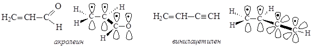 В молекулах акролеина и винилацетилена сопряженная система возникает при участии четырех р-орбиталей, на которых находятся четыре электрона. В акролеине в p,p-сопряжении задействованы три р-орбитали атомов от трех атомов углерода, находящихся в sp2-гибридизации, и р-орбиталь атома кислорода. В винилацетилене в p,p-сопряжении участвуют две р-орбитали от двух атомов углерода, находящихся в sp2-гибридизации, и две р-орбитали от двух атомов углерода, находящихся в sp-гибридизации. p,p-Сопряжение может быть и в циклических молекулах.
