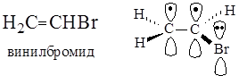 В молекуле винилбромида в р,p-сопряжении участвуют две р-орбитали атомов углерода, образующие p-связь, и р-орбиталь атома брома, не участвующая в образовании p-связи. Таким образом, в молекуле винилбромида на трех р-орбиталях делокализуются четыре электрона.