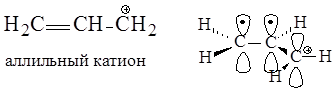 В аллильном катионе в р,p-сопряжении участвуют две р-орбитали атомов углерода, образующие p-связь, и вакантная р-орбиталь атома углерода, несущего положительный заряд. На трех р-орбиталях делокализуются два электрона и положительный заряд.