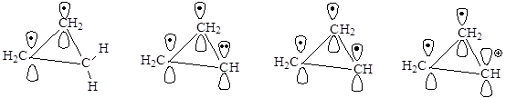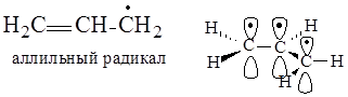 В аллильном радикале в создании сопряженной системы участвуют две р-орбитали, образующие p-связь, и р-орбиталь sp2-гибридизированного атома углерода, имеющая неспаренный электрон. На трех р-орбиталях делокализуются три электрона. Как и p,p-сопряжение, р,p-сопряжение может иметь место в циклических системах.
