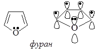 В молекуле фурана р-орбиталь атома кислорода, несущая неподеленную пару электронов, вступает в сопряжение внутри цикла с четырьмя р-орбиталями атомов углерода, образующими p–связи. В итоге возникает сопряженная система, в которой на пяти р-орбиталях делокализованы шесть электронов.