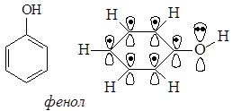 В молекуле фенола р-орбиталь атома кислорода, имеющая неподеленную пару электронов, вступает в р,p-сопряжение с р-орбиталью атома углерода, которая участвует в p,p-сопряжении внутри цикла. В этом случае возникает сопряженная система, в которой на семи р-орбиталях делокализованы восемь электронов. Степень термодинамической устойчивости молекул характеризуется энергией сопряжения. Энергия сопряжения (энергия делокализации) – это та часть энергии, которую молекула теряет в результате сопряжения. Чем больше энергия сопряжения, тем стабильнее сопряженная система. Один из способов определения этой величины состоит в сравнении теплоты гидрирования бензола с ее расчетным значением, основанным на предположении о том, что бензол содержит три изолированные двойные связи: