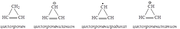 Эффект стабилизации присущ не только сопряженным шестичленным системам, но и трех-, четырех-, пяти-, семичленным системам, в которых число электронов, участвующих в сопряжении, удовлетворяет правилу Хюккеля. Такие соединения известны и подробно изучены. Они получили название небензоидных ароматических соединений. Среди циклопропана и его производных ароматичным является только циклопропенил-катион, удовлетворяющий всем критериям ароматичности.