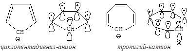 Но циклопентадиенил-анион и циклогептатриенил-катион – (катион тропилия) являются ароматическими системами, удовлетворяющими всем критериям ароматичности (все они имеют в сопряжении по 6 электронов).