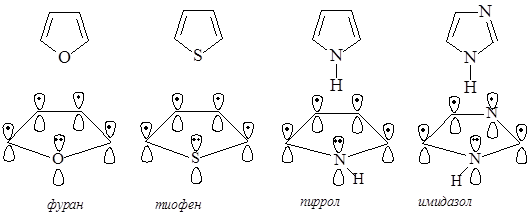 Среди гетероциклических ненасыщенных соединений тоже есть соединения, удовлетворяющие критериям ароматичности. Типичными представителями пятичленных гетероциклических ароматических соединений являются фуран, тиофен, пиррол, имидазол.